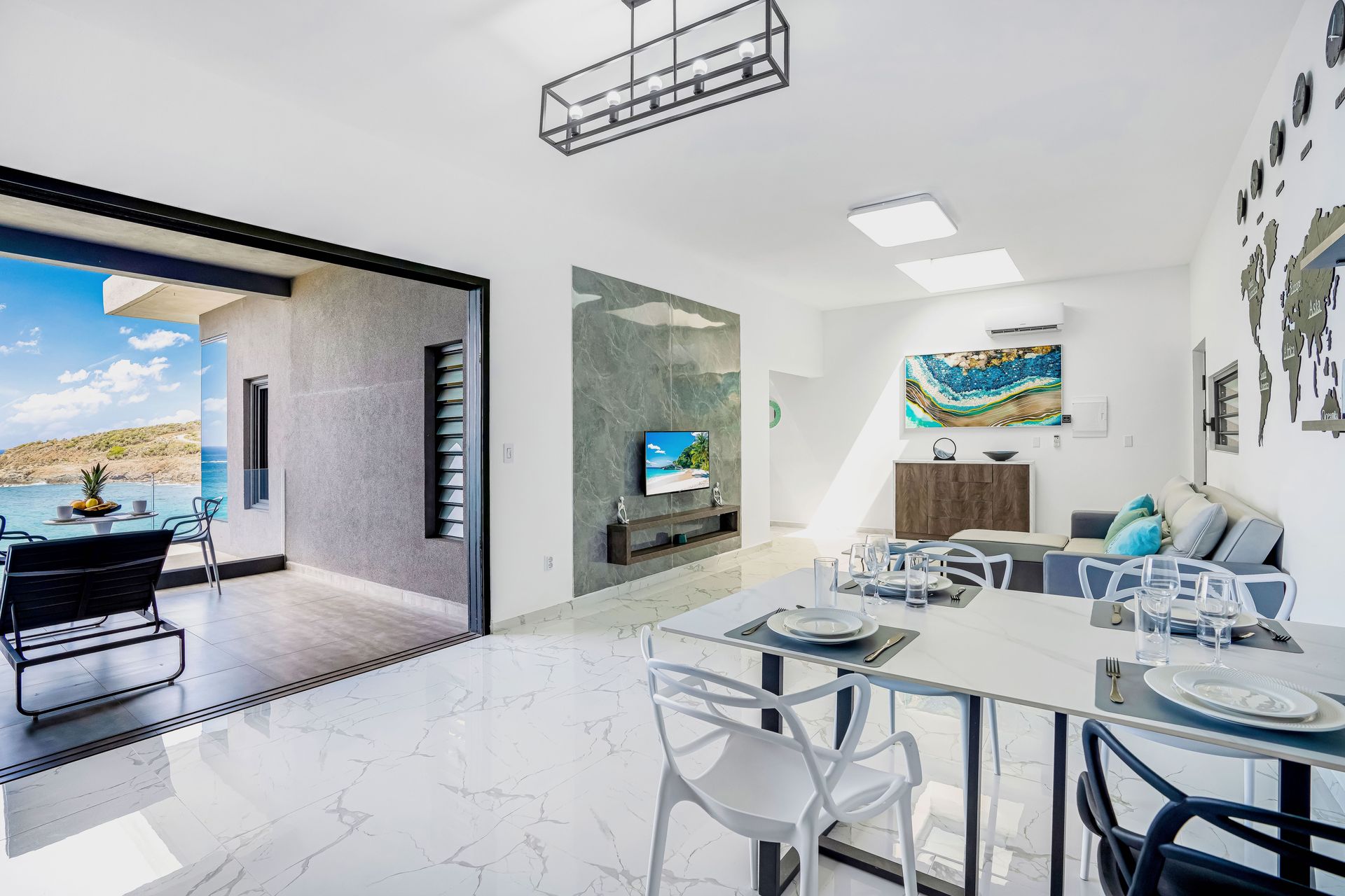 The panoramic apartment is located by the seaside, the 20m2 bedroom is bright and luminous. From your bed, you'll enjoy a breathtaking view of the sea, as if you were on a boat. You can see cruise ships heading towards Philipsburg and, in the distance, the islands of Saba and St Kitts. The bathroom is also equipped with a window overlooking the bay. A 20m2 seaside terrace where you'll be lulled by the sound of the waves. A spacious living room of 40m2 with a sofa bed that can accommodate two additional people and a fully equipped kitchen for 4 people.